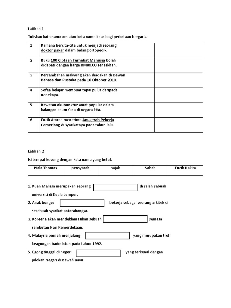 Latihan Kata Nama Am Dan Khas : Latihan 1 ( kata nama am dan kata nama khas).