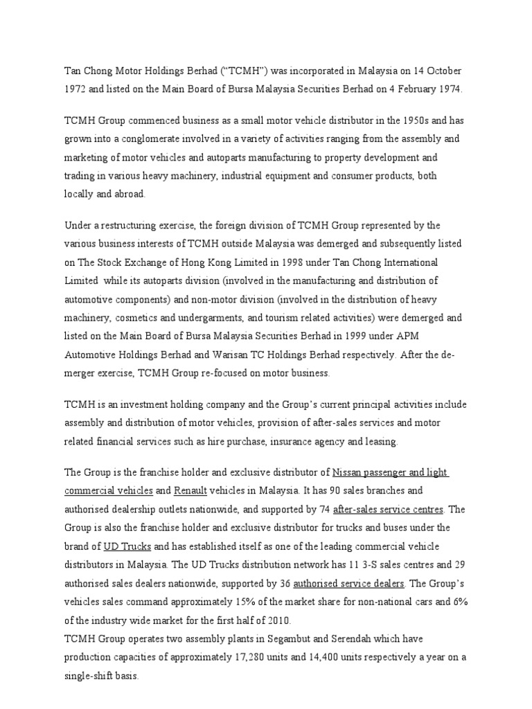 Tan Chong Motor Holdings Berhad Nissan Land Vehicles from imgv2-1-f.scribdassets.com Home malaysia transportation equipment manufacturing tan chong motor holdings berhad. Tan chong motor holdings : Tcmh was founded in 1972 and based in kuala lumpur, malaysia. To assist corpporate sales head & marketing department to obtain market. Tan chong motor holdings berhad (myx: Tan chong motor holdings berhad, through its subsidiaries, is engaged in the assembly, distribution, and sale of passenger and commercial vehicles primarily in malaysia. It seems that the royal at press time there has been no statement as yet from tan chong management in malaysia on this large tax bill. Msu don't tell people how to do things, tell them what to do and let them surprise you with their results.